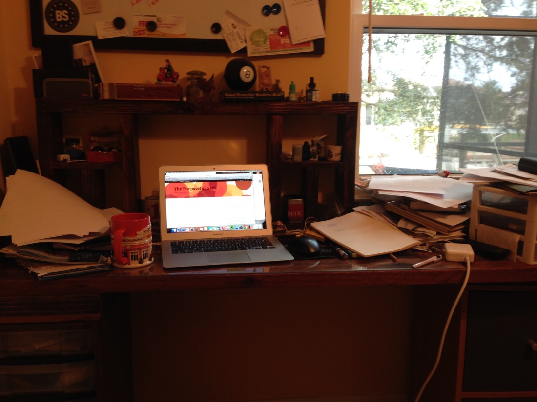 I hate a messy desk. I think there are gremlins in my office in that come out at night and put stuff on my desk in random places. Usually my keyboard. Or on top of whatever I need the most. I think they hide my phone under a brochure the same color as my case. Which is hard, cause I have a spiderman cover on my phone. They hide my pens, too. I keep a pen on my nightstand, but when I look for it, it is always on my desk in the office under a pile of old bills I swear I filed away. I currently have three journals, 14 pens, a broken set of earbuds, a 25 foot tape measure, an unused iPhone case, a High School yearbook, the remote for the living room TV (don’t ask), my old sunglasses … well you get the picture.